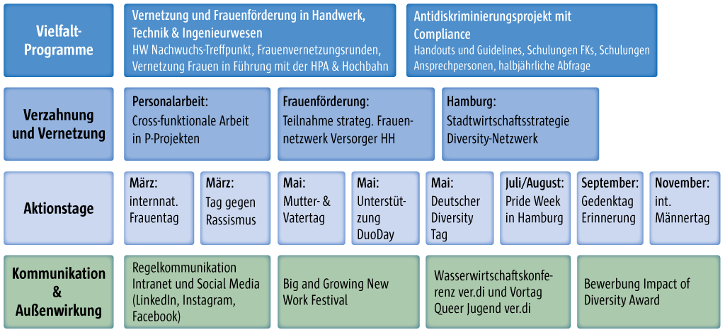 In diesem Zusammenhang wird immer wieder hervorgehoben: Vielfalt allein reicht nicht, sondern kann auch richtig anstrengend und konfliktträchtig werden. Ohne gemeinsame Team- und auch Unternehmenskultur können Unterschiede auch zu Missverständnissen oder Konflikten führen. Deshalb sprechen viele Unternehmen heute nicht mehr nur von „Diversity“, sondern von Diversity, Equity, Inclusion & Belonging (DEIB) – und rücken damit auch Chancengerechtigkeit und Zugehörigkeit in den Fokus Neben der Wertschätzung von Vielfalt braucht es eben diese Zugehörigkeit, um sowohl Anerkennung für die eigene Identität zu erfahren als auch, um eine „Wir-Kultur“ zu empfinden. [1, 15, 16, 17]. Bei uns bei HAMBURG WASSER wurde daher das Diversity Management auch an das Team der Organisationsentwicklung angegliedert, um die Team , Unternehmens- und Zusammenarbeitskultur ganzheitlich zu denken.